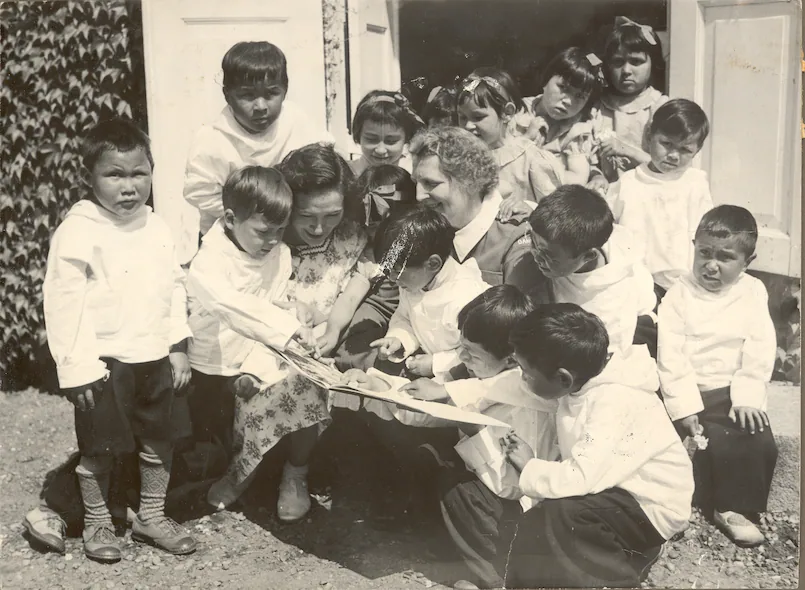 Grupa grenlandzkich dzieci Inuitów biorących udział w duńskim eksperymencie spotyka królową Ingridę z Danii w 1951 roku. (Zdjęcie: Save the Children Denmark)